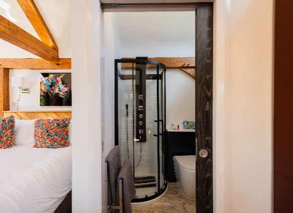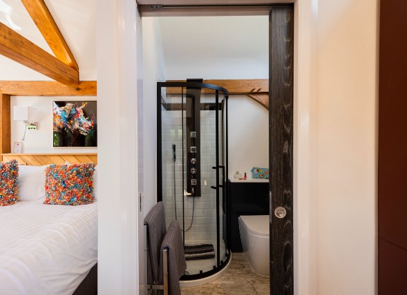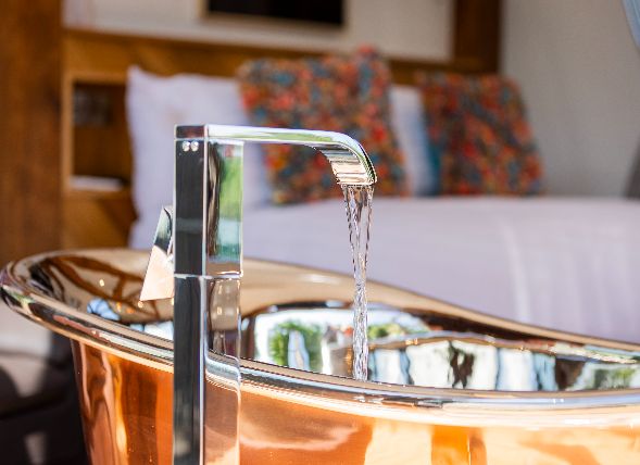 It does. You’ll find a luxurious copper double-ended bath and a rainfall shower with massage jets, plus a heated towel rail and fluffy towels.