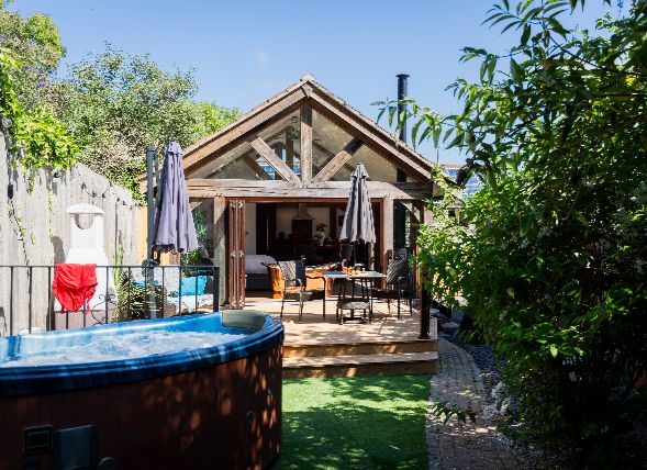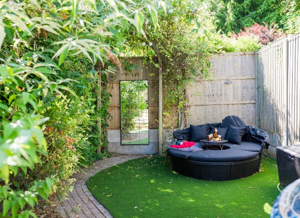 As you head through the bifold doors to the outside of the property, you’ll discover a large outdoor deck area complete with seating, dining furniture, and a BBQ for lazy al fresco breakfasts or romantic dinners under the summer sky. A winding path takes you to the back of the garden. There, you’ll come across a comfortable circular daybed where you can snooze, snack, or simply watch the world go by.