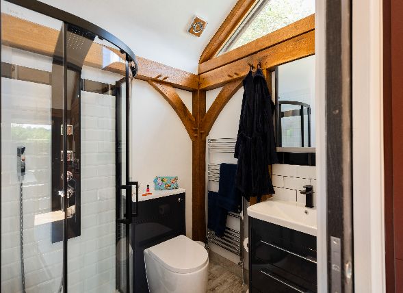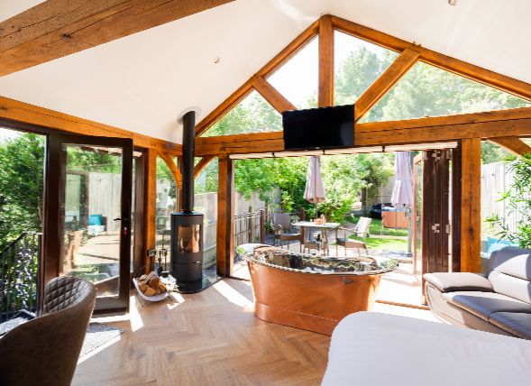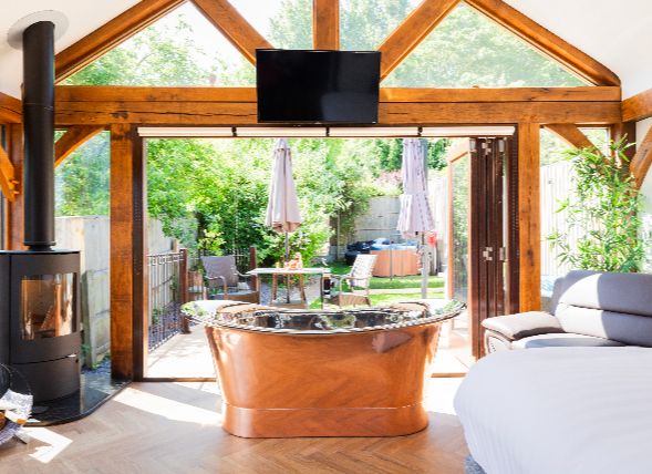 While you’re bound to be seduced by the lavish copper bath, the property also boasts a high-spec rainfall shower with massage jets, perfect for rinsing off in before heading out to soak in the hot tub. On frosty winter nights, Olivia’s large Scandi-style log burner is the perfect evening companion. Load it up with logs, pour yourself something to sip on, and let the world fade while you switch off and get toasty.